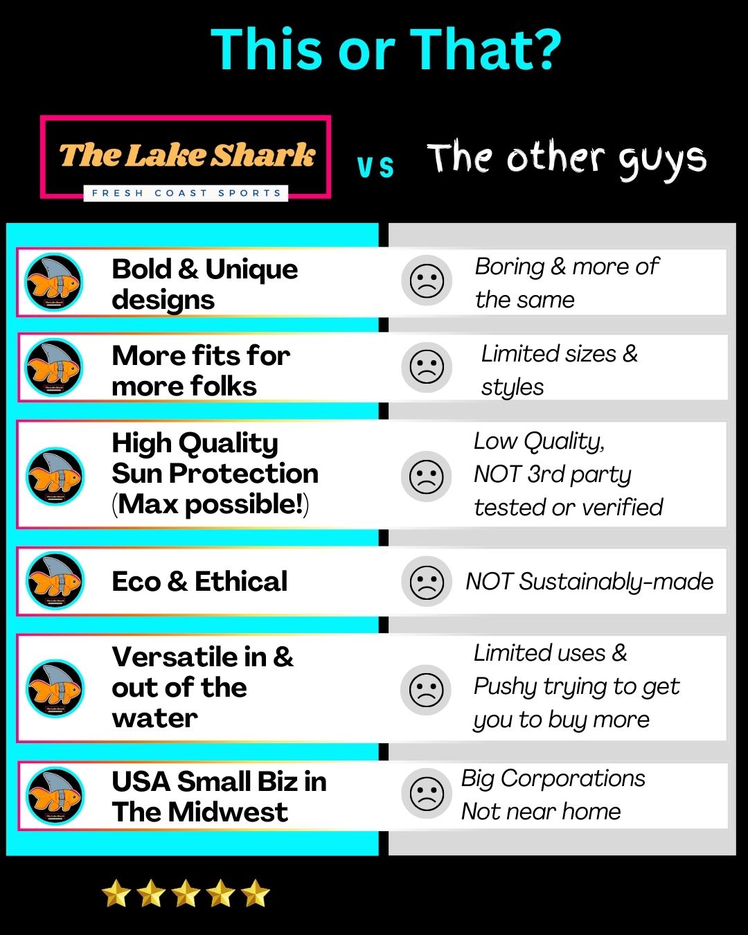 The Lake Shark products use high-quality tech performance fabrics & are produced in an ethical and eco-friendly supply chain. You can feel good about helping us make a positive impact!