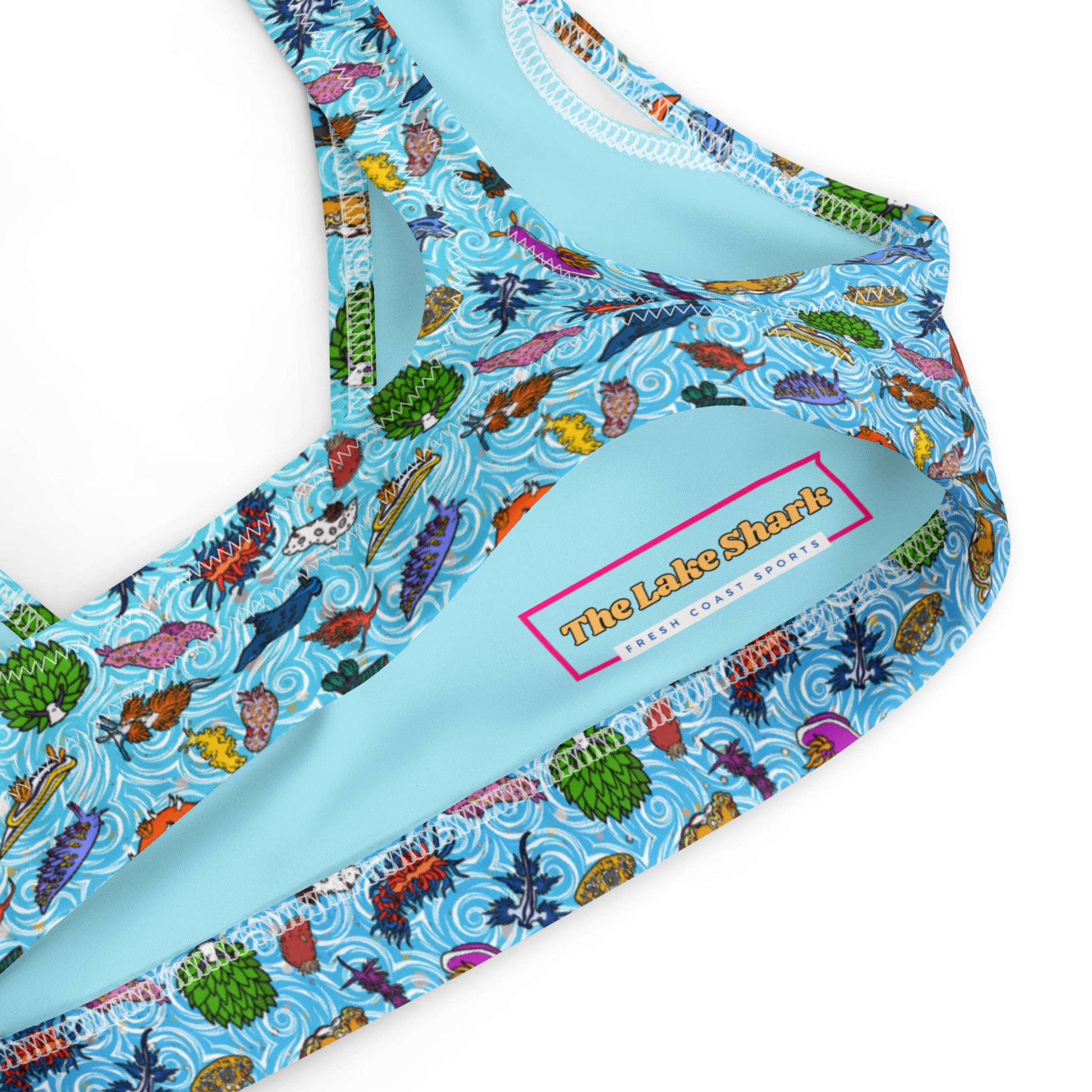 Featuring tons of tiny colorful Nudibranch sea slugs on a swirly tropical sea of background blues, this Bikini Top is: