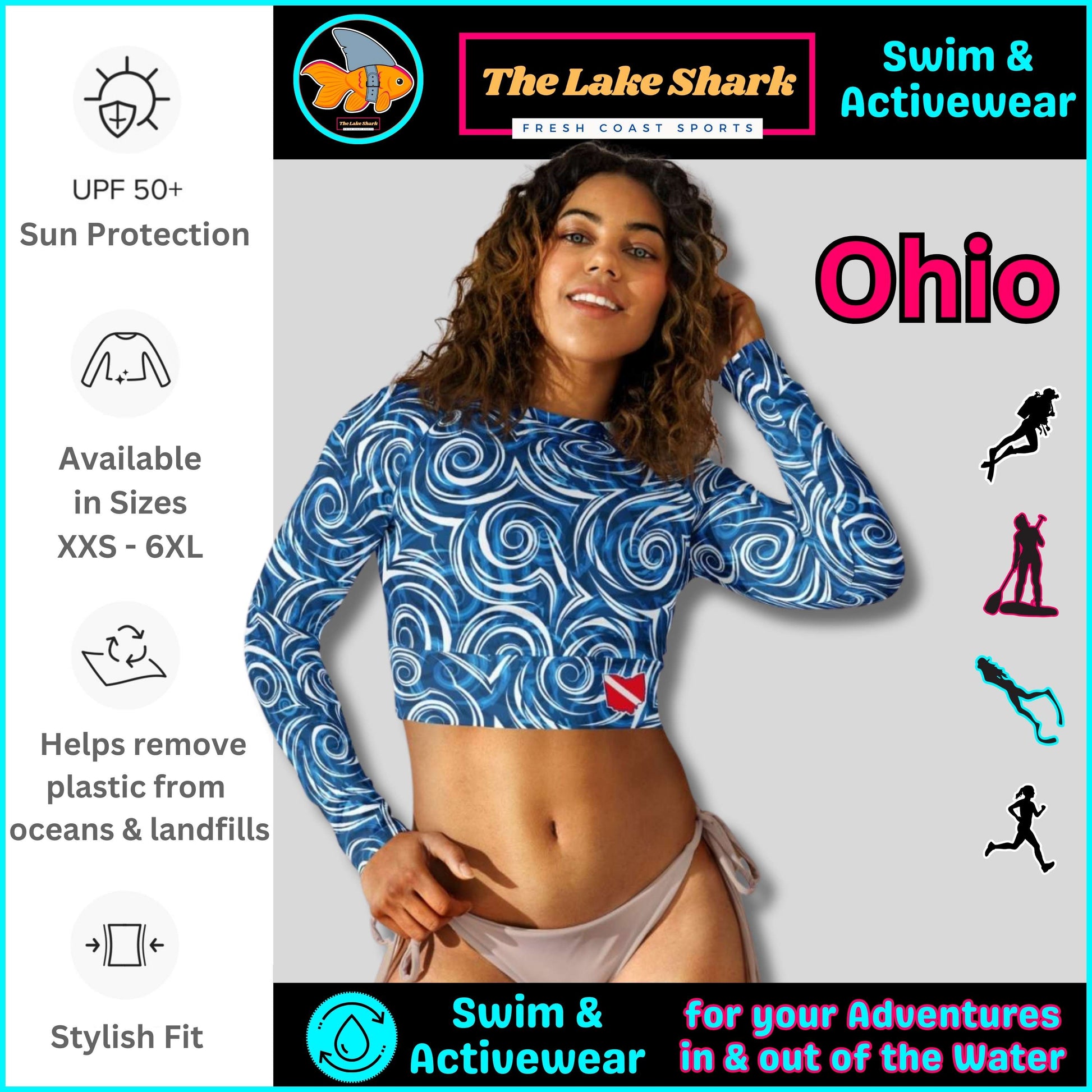 - all The Lake Shark goodness: Perfect for IN + Out of the water, Max possible Sun Protection, Moisture-wicking, Quick Dry, ECO-friendly, Sustainably produced, supports a woman-owned small business, and available in a wide range of sizes (from XXS to 6XL)... Heyyyy! DONE! Getting a Women's Crop-Top Rashie is the easiest decision you'll make all day!